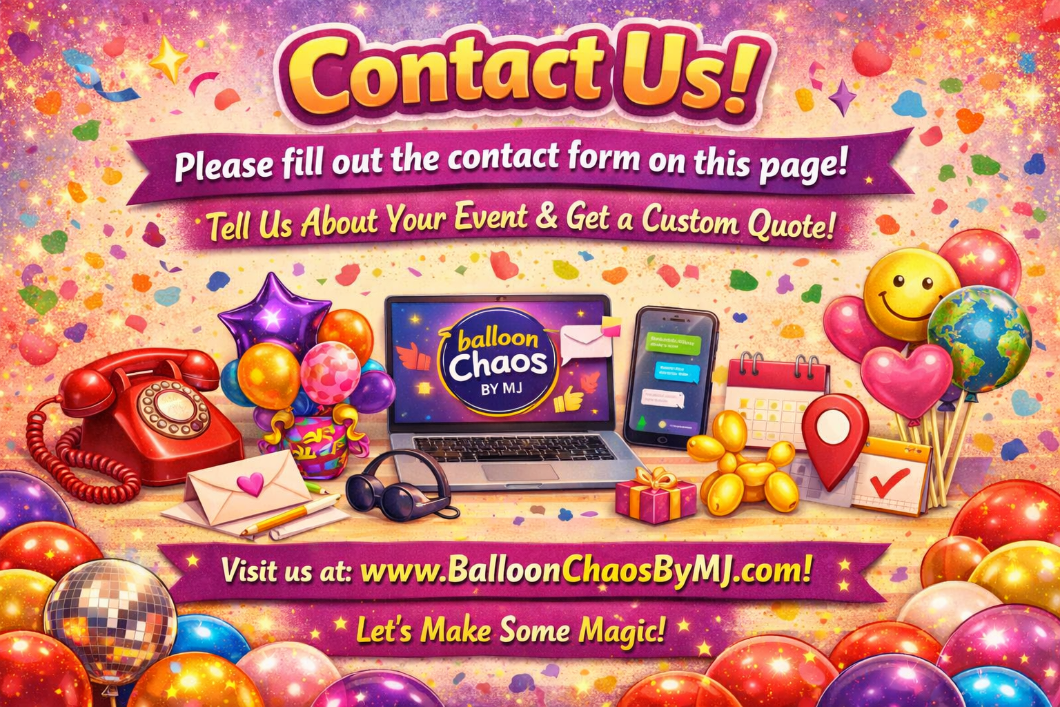 You can also visit us anytime at www.BalloonChaosByMJ.com to explore our services, see our latest creations, and get inspired for your next event.